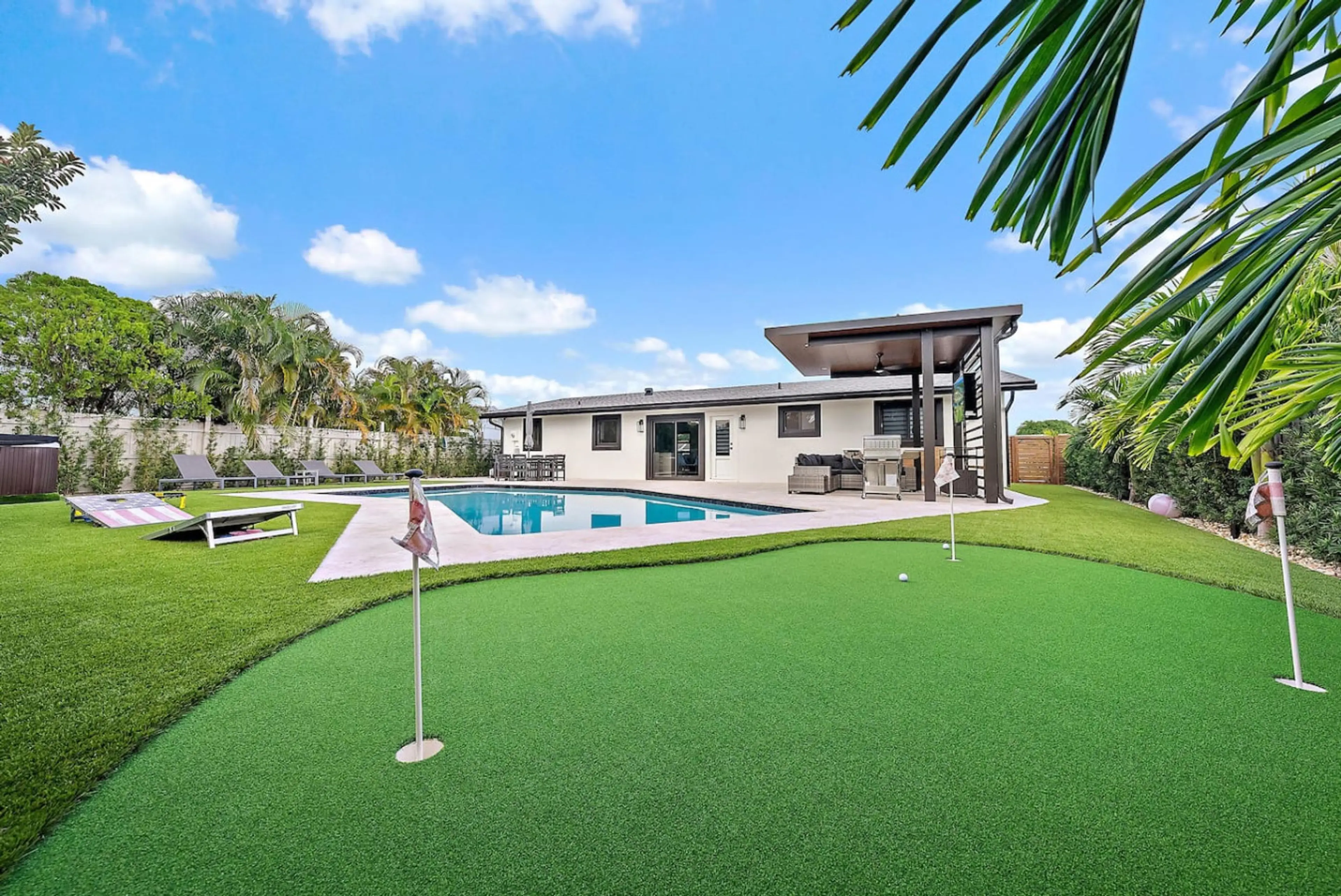 Discover a peaceful retreat in Palm Beach Gardens. Set on a quiet, family-friendly street, this refreshed 4-bed, 2-bath home combines modern comfort with outdoor perks—take a dip in the pool and hot tub, relax under the awning with a fire place and TV, work on your short game, play spike ball or cor...